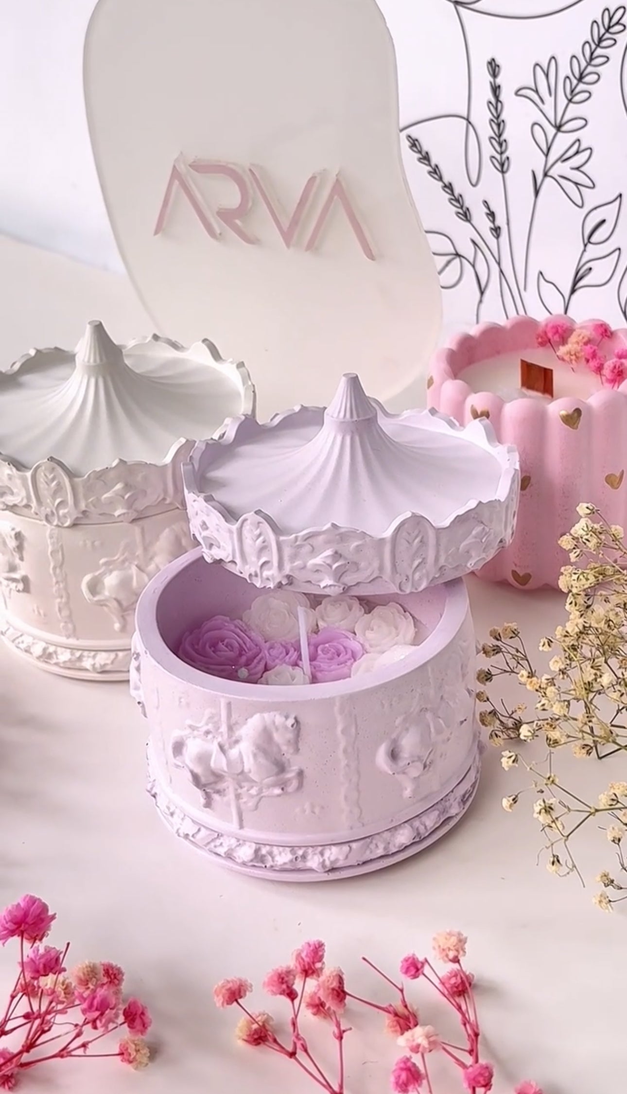 Illuminate your space with our Carousel Pot Candle, featuring a cute and vintage design. The engraved detailed design adds a touch of sophistication to your home. With this candle, you can create a cozy ambiance and add a unique decorative element to any room.