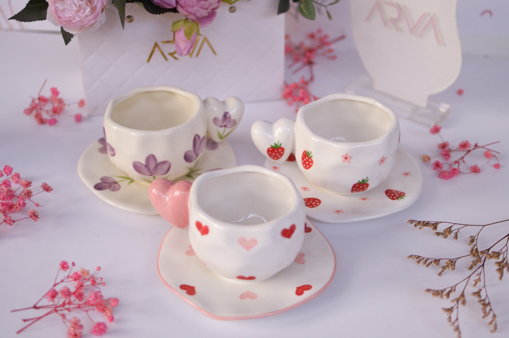Heart Handle Ceramic Mug & Saucer Set