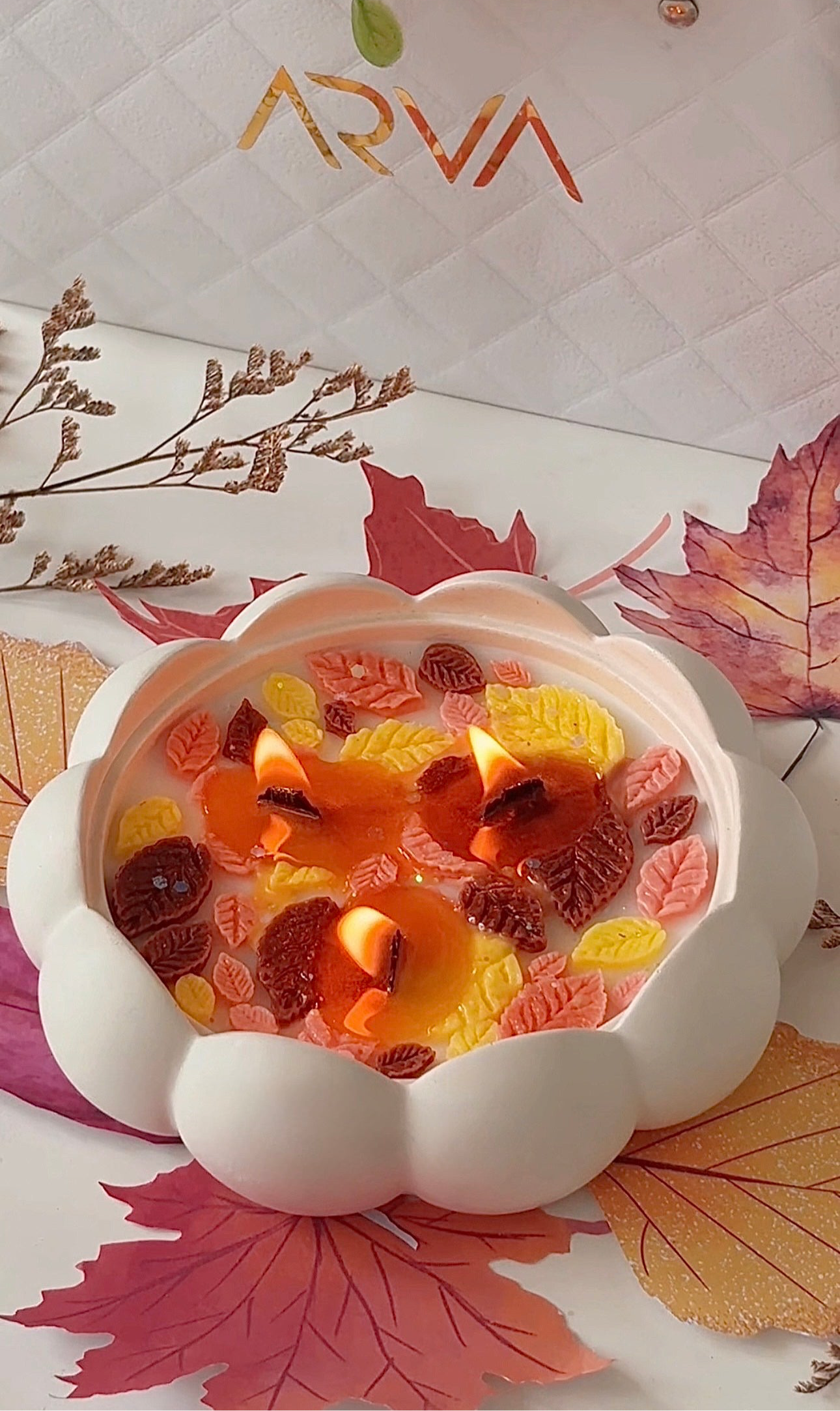 Introducing our luxurious Huge Fall-themed Candle, perfect for adding a touch of elegance to your fall decor. Adorned with vintage fall leaves designs, this shimmering candle makes for a stunning addition to any centre table. Let the warm glow and captivating fragrance of our candle transport you to a world of autumnal beauty. 🍂✨