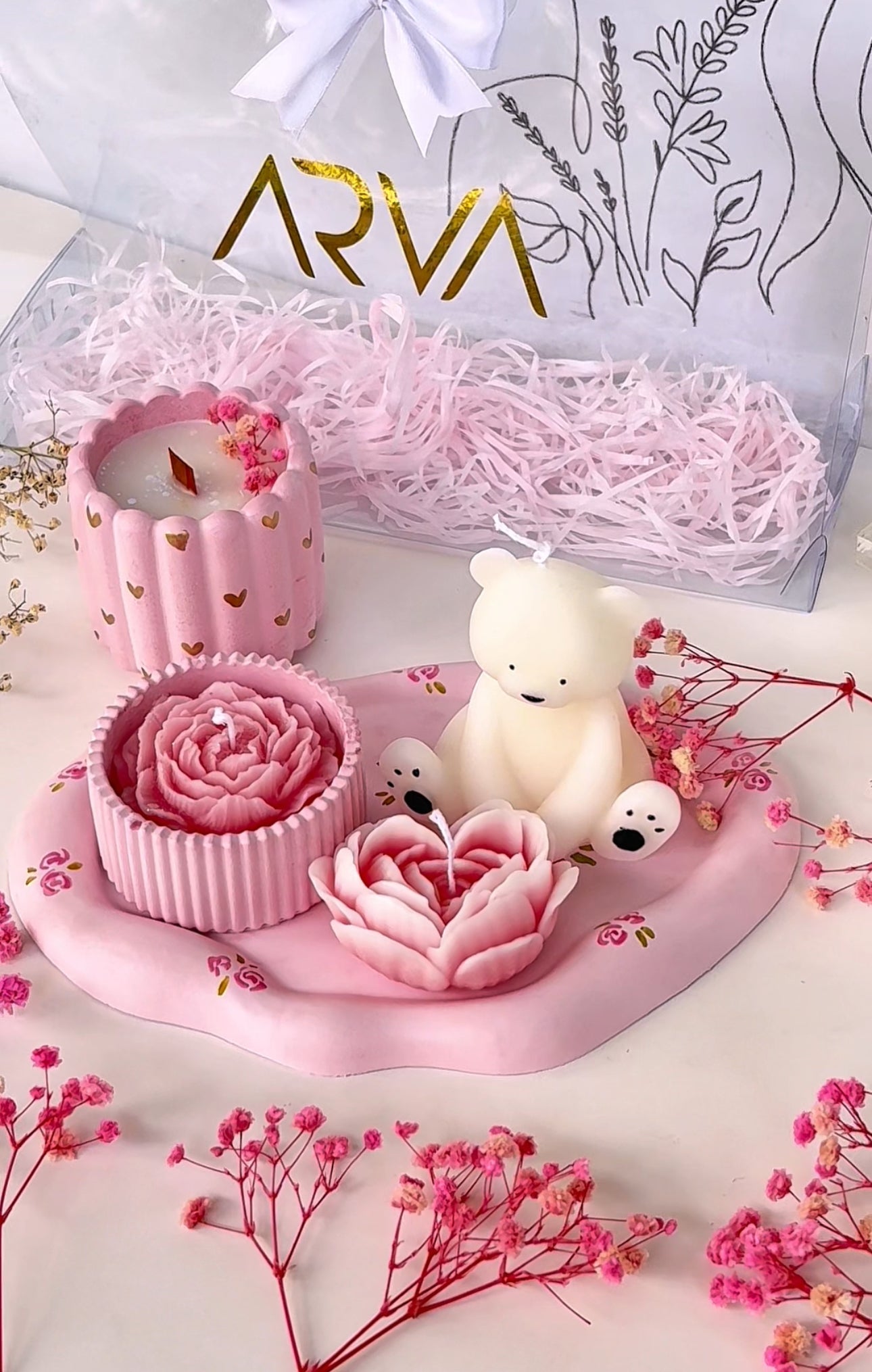 Brighten up any occasion with this adorable gift set featuring all things pink! Perfect for the girly girl, this set includes a hand-painted tray, a huge teddy candle, a heart-shaped rose candle, and a scented rose pot candle. Spread some pink vibes and warmth with this cute and lovely set.