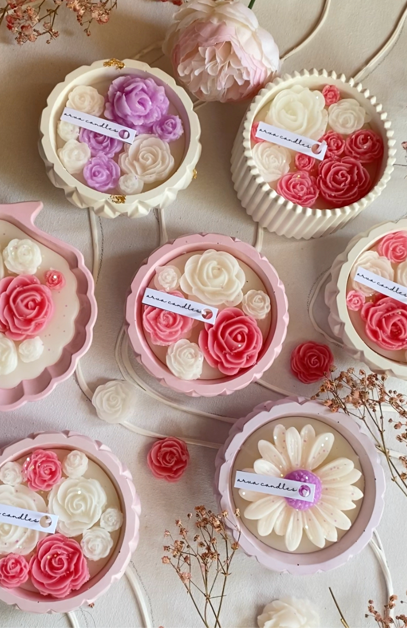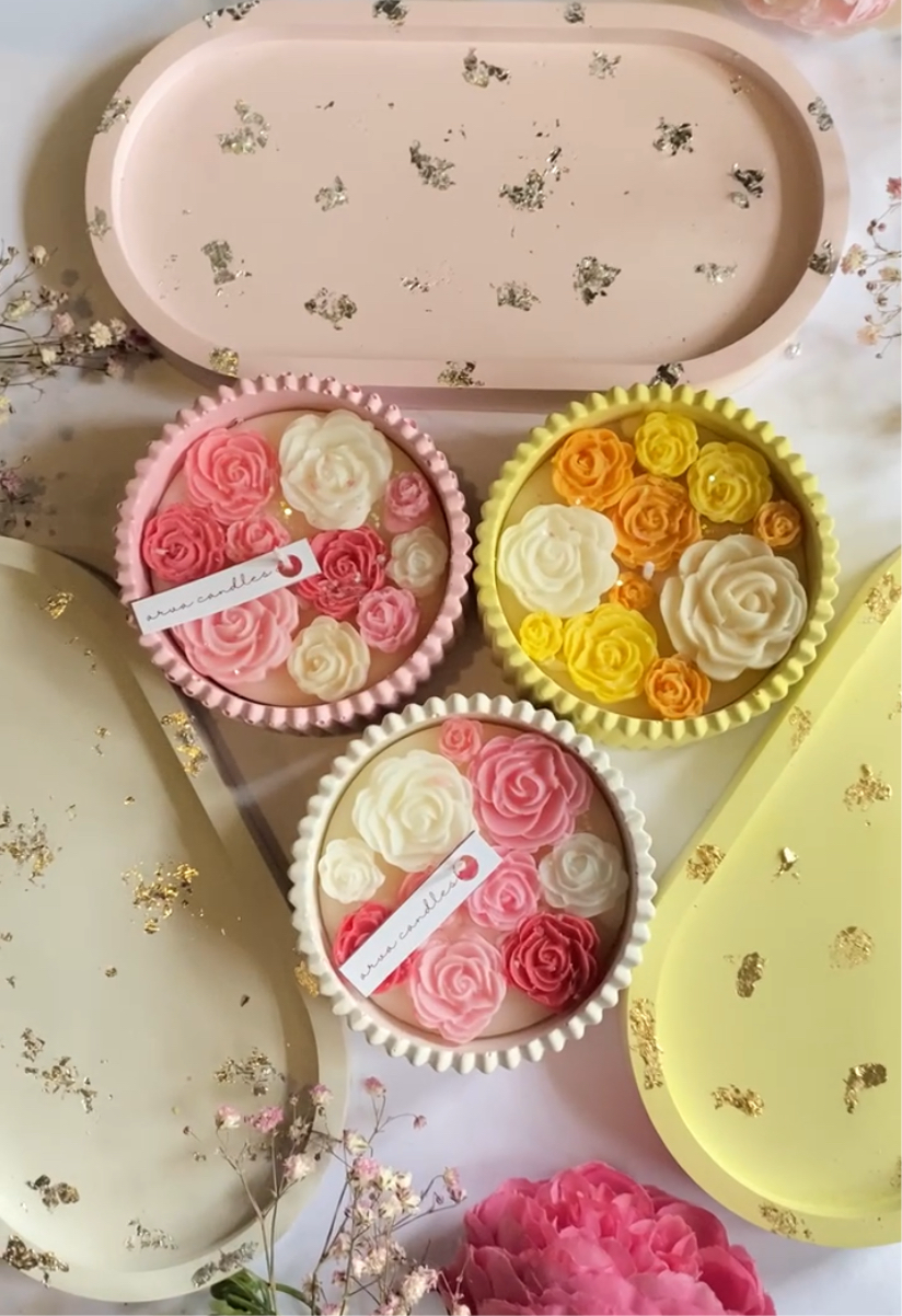Organize and set the mood with our oval trinket tray and pot candle duo. Adorned with gold or silver flakes and infused with five floral & sweet scents, this set adds beauty and ambience to any space. Perfect for gifting or treating yourself!